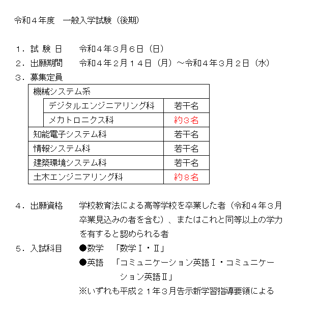 令和4年度一般入学試験(後期)の応募状況をお知らせ…