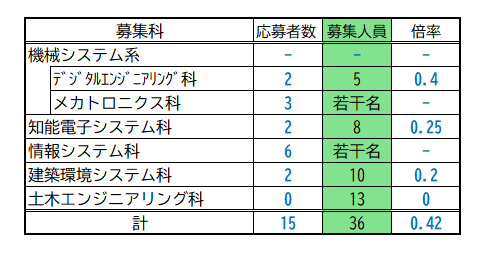 2026.03.05 令和8年度一般入学試験(後期)の応募状況をお知らせします。 山形県立産業技術短期大学校 令和8年度一般入学試験(後期)の応募状況(令和8年3月2日確定)は下記のとおりです。 共有:クリックして Twitter で共有 (新しいウィンドウで開きます)Facebook で共有するにはクリックしてください (新しいウィンドウで開きます)いいね:いいね 読み込み中… 関連