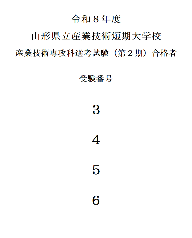 2026.02.09 令和8年度 産業技術専攻科選考試験(第2期)の合格者をお知らせします。 令和8年2月3日(火)に実施した「令和8年度山形県立産業技術短期大学校 産業技術専攻科選考試験(第2期)」の合格者受験番号は下記のとおりです。 共有:クリックして Twitter で共有 (新しいウィンドウで開きます)Facebook で共有するにはクリックしてください (新しいウィンドウで開きます)いいね:いいね 読み込み中… 関連
