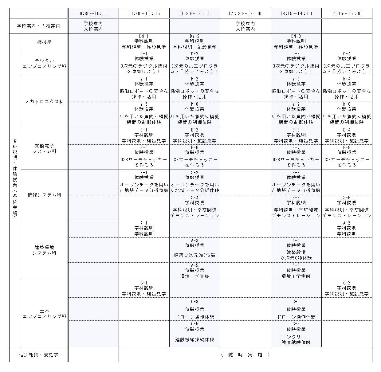 - 内 容:学校案内、入試案内、学科説明・施設見学、体験授業、個別相談、学生寮見学